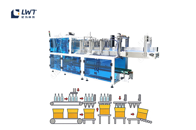 ? 自動化程度高:可根據預設的產品箱數要求,自動完成產品整理、排列、跌落裝箱等工序,裝箱后的產品自動送入輸送滾筒,無需人工干預,有效減少人力成本,避免人為操作誤差。